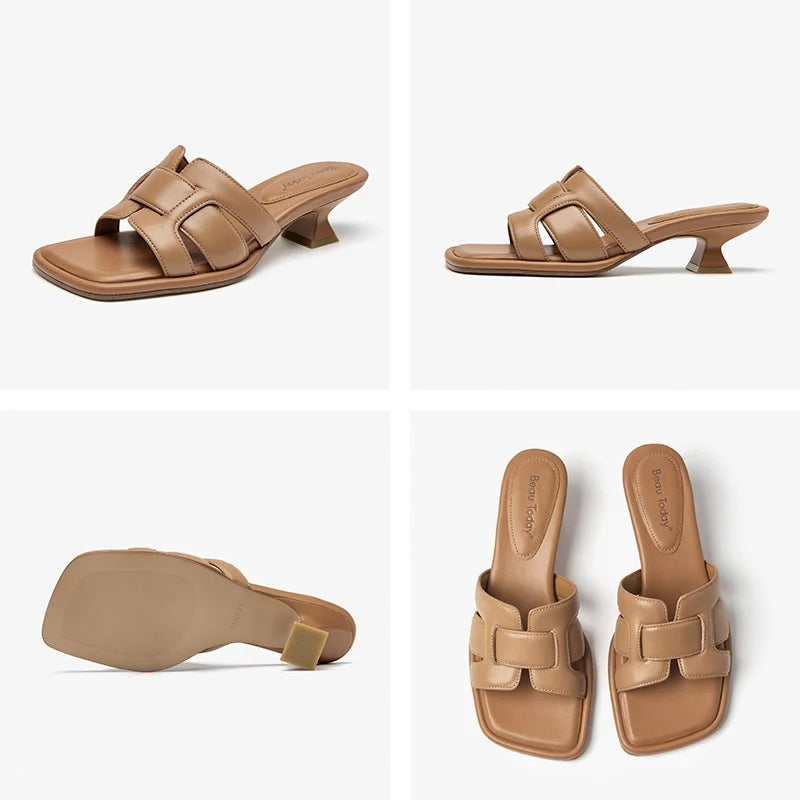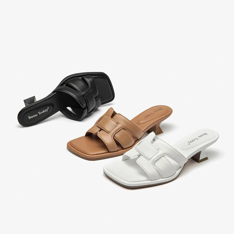 BEAUTODAY Roman Slippers Women Genuine Leather Woven Square Toe Slip-on Flats Outdoors Ladies Mid Heel Shoes Handmade 35111
