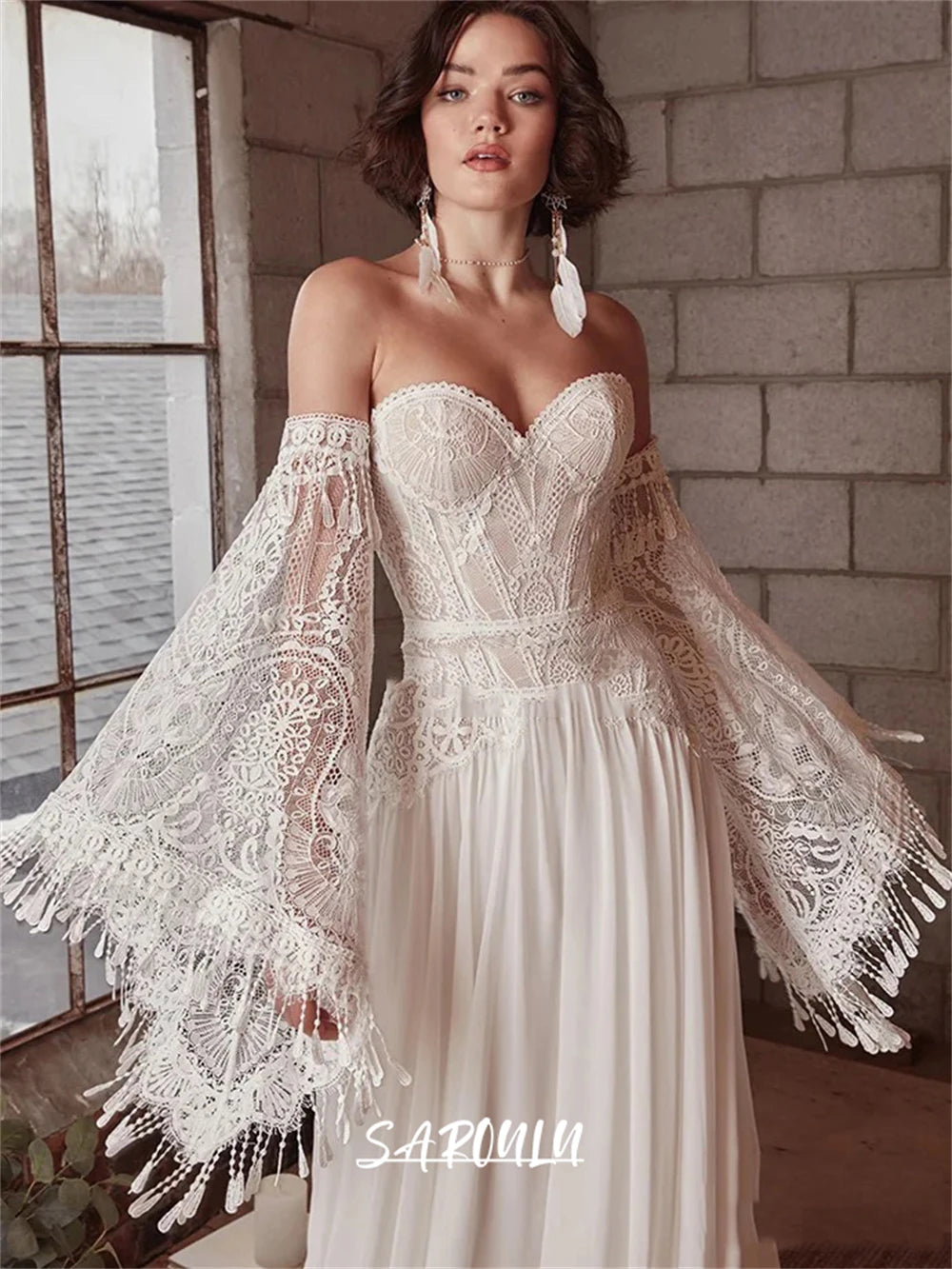 Bohemian Bride Dress with Long Sleeves, Unique Lace Beach Wedding Dresses for Women, Boho Chiffon Bridal Gown Custom Make