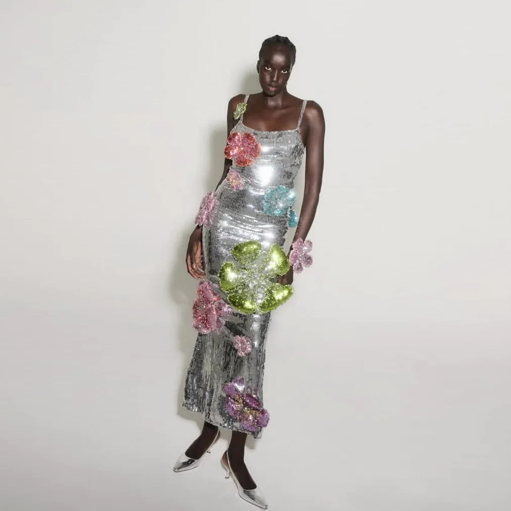Glitter Silver Spaghetti Long Prom Dresses Sequins Mermaid Women Dress Ankle-length 3D Floral Beads Prom Gowns Customized