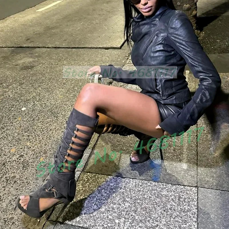 Grey Belt Buckles Tall Sandal Boots Women Trendy Sexy Puttee Cross Strap Heeled Shoes Ladies Open Toe White Flock Hollow Sandals