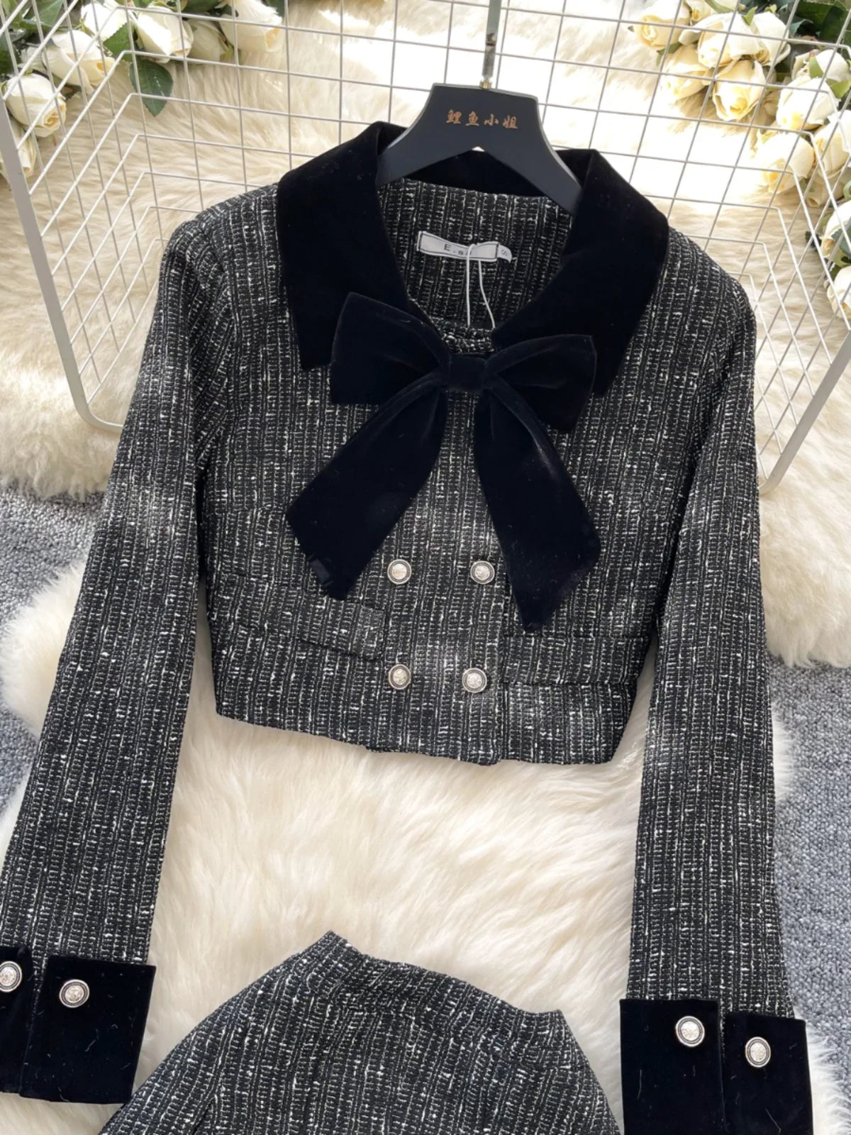 High Waist Midi Skirt And Coat Set for Women in Tweed Material with Long Sves And Bow Design Vintage And Faionable