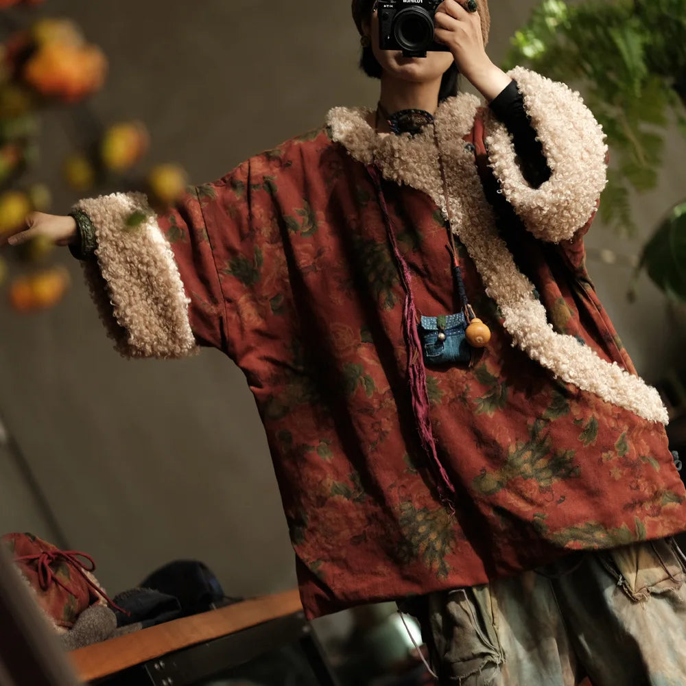 Johnature Women Corduroy Print Floral Parkas Red Winter Coats 2025 Warm Patchwork Wool Plus Cotton Women Loose Pullover Parkas
