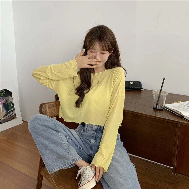 Sexy Sheer Mesh Women Swimsuit Cover Up Thin Ice Silk Beach Cover Up Candy Color Crop Tops See Through T-Shirt Sun Protection