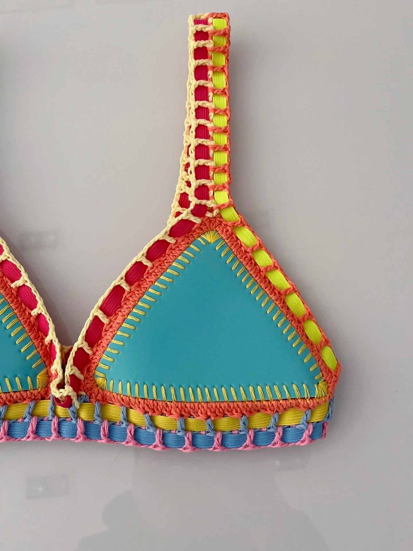 Turquoise Women Sexy Neoprene Triangle Swimsuit Swimming Wear Set Crochet Bikini Beachwear Bathing Suit For Vacation Wear