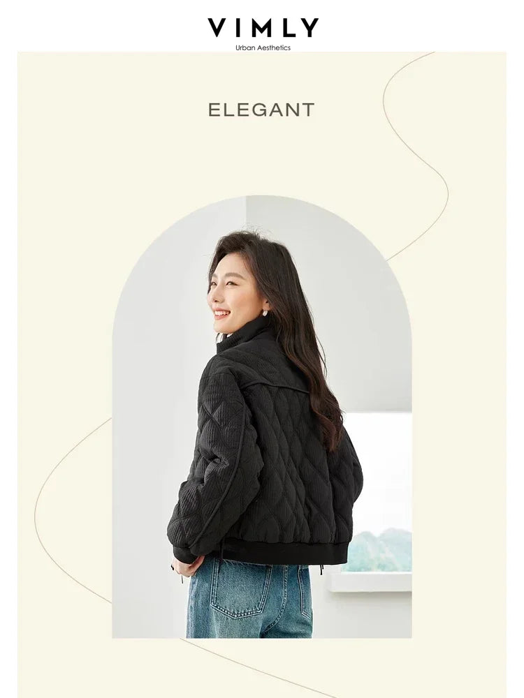 Vimly Cropped Argyle Quilted Jackets Women 2023 Casual Straight Loose Stand Collar Zipper Thick Warm Winter Coat for Women M3613