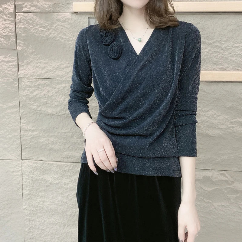 Women's Clothing Autumn Sexy V Neck 3D Flower Ruched Elegant Basic T-shirts Fashion Bright Silk Long Sleeve Slim Pullover Tops