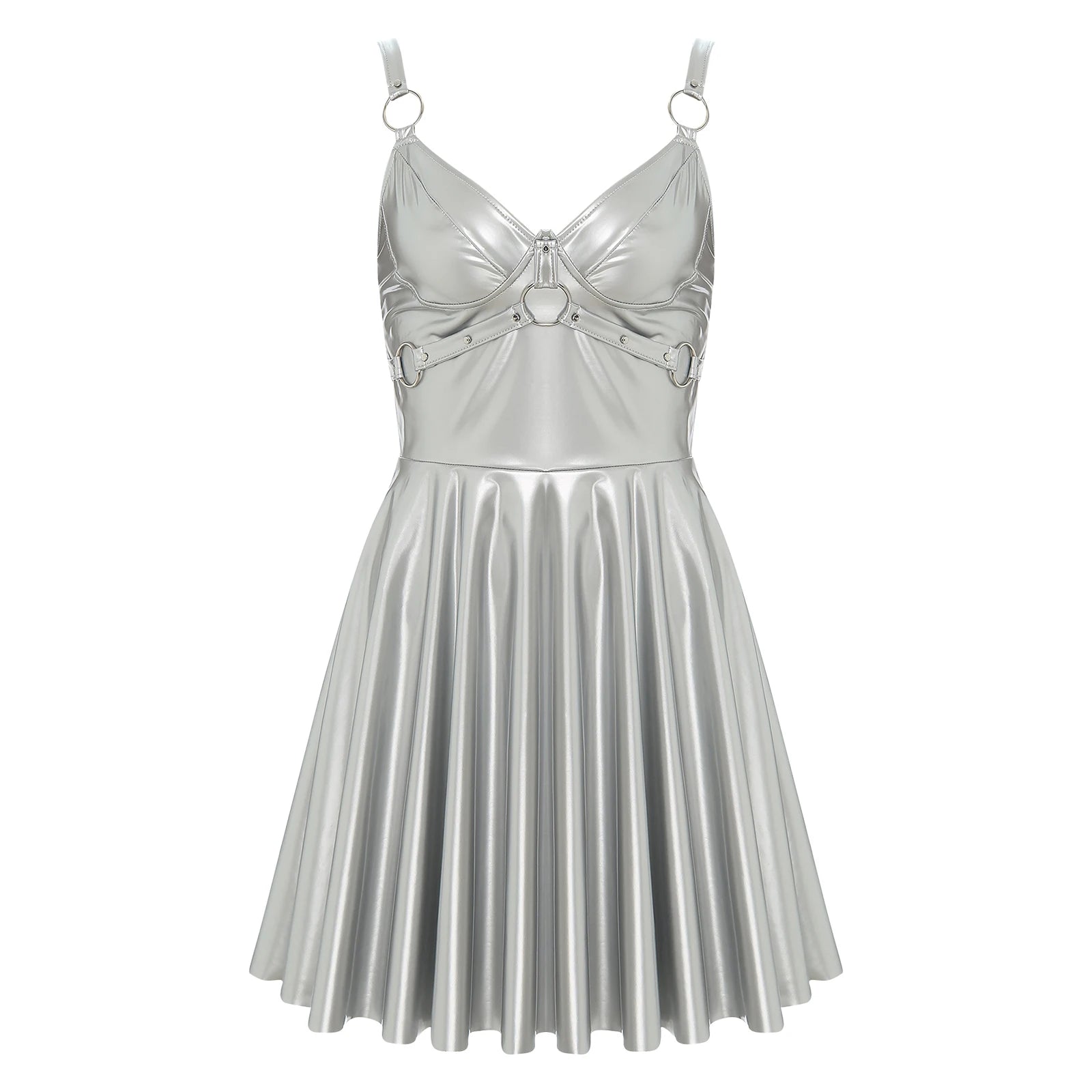 Women's Wet Look Patent Leather Dress O-Ring Rivets Strappy Latex Shiny Vinyl Slip Dress Outfit Gothic Party Dress Clubwear